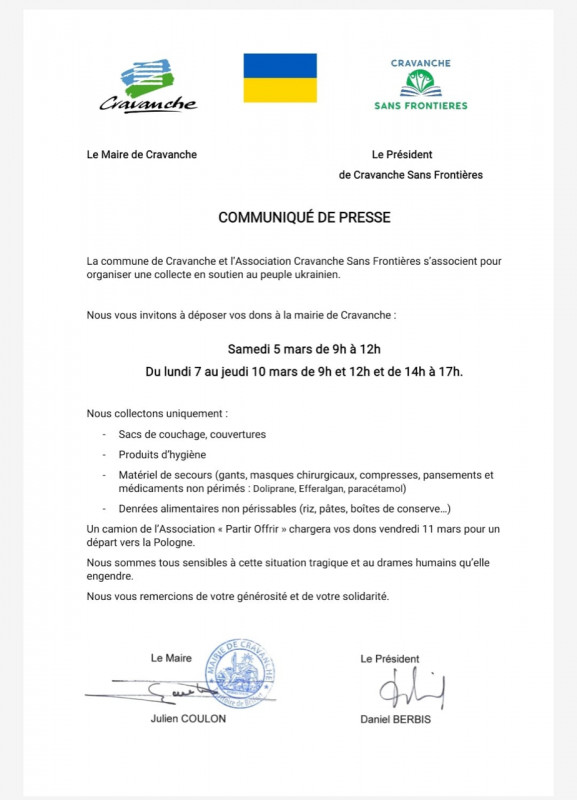 Du samedi 5 au jeudi 10 mars 2022, la Marie de Cravanche et Cravanche Sans Frontières organisent une collecte de dons en soutien au peuple ukrainien.
