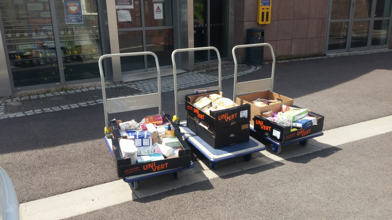 Lors de la collecte bio solidaire organisée en partenariat avec les magasins Biocoop les 4 et 5 juin derniers, nous avons récolté dans chacun des magasins participants (Belfort et Valdoie) plusieurs chariots remplis de denrées non périssables (pâtes, riz, café, chocolat, conserves, boissons, produits d'hygiène et d'entretien...).