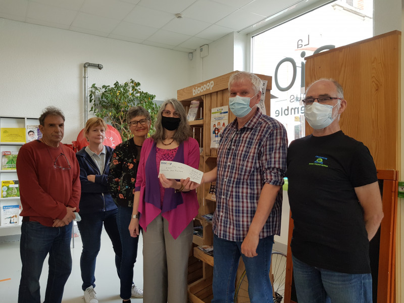 En outre, les magasins Biocoop s'étaient engagés à nous verser la marge réalisée sur les produits donnés par leurs clients. Le 25 juin, un chèque d'un montant de 500 € a donc été remis aux représentants de Cravanche sans Frontières.